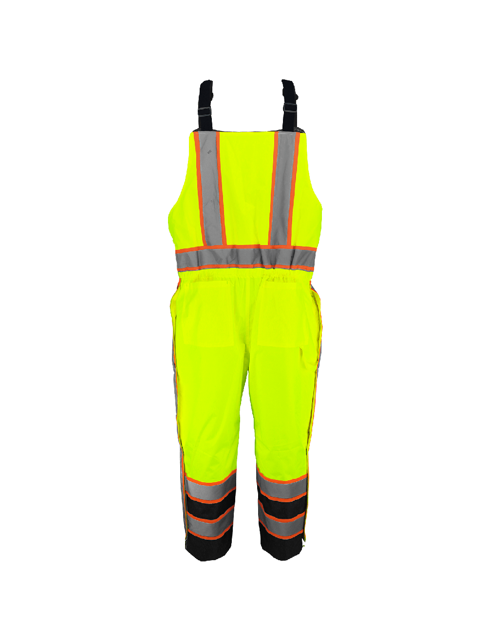 These insulated winter bibs are high-visibility yellow/green with a polyurethane-coated 300D Oxford polyester exterior. Black ripstop material below the knee for added durability. The black quilted polyester taffeta interior provides a smooth, comfortable fit. Features 185g/m² polyester insulation, 3M™ reflective material with contrasting orange trim, and fully taped seams. Adjustable elastic shoulder straps include buckles for a custom fit. These bibs have an elastic back at the waist, a reinforced triangle crotch, a rear right hammer loop, and hook-and-loop elastic leg cuff storm flaps. The pockets include four outer front pockets and two outer rear pockets. The right pocket has pass-through access to reach garments worn under the bibs. The closures include a two-way zipper and metal snaps front closure with a storm flap, as well as a two-way extra-long zipper and snap closure along the side of the legs with a storm flap.