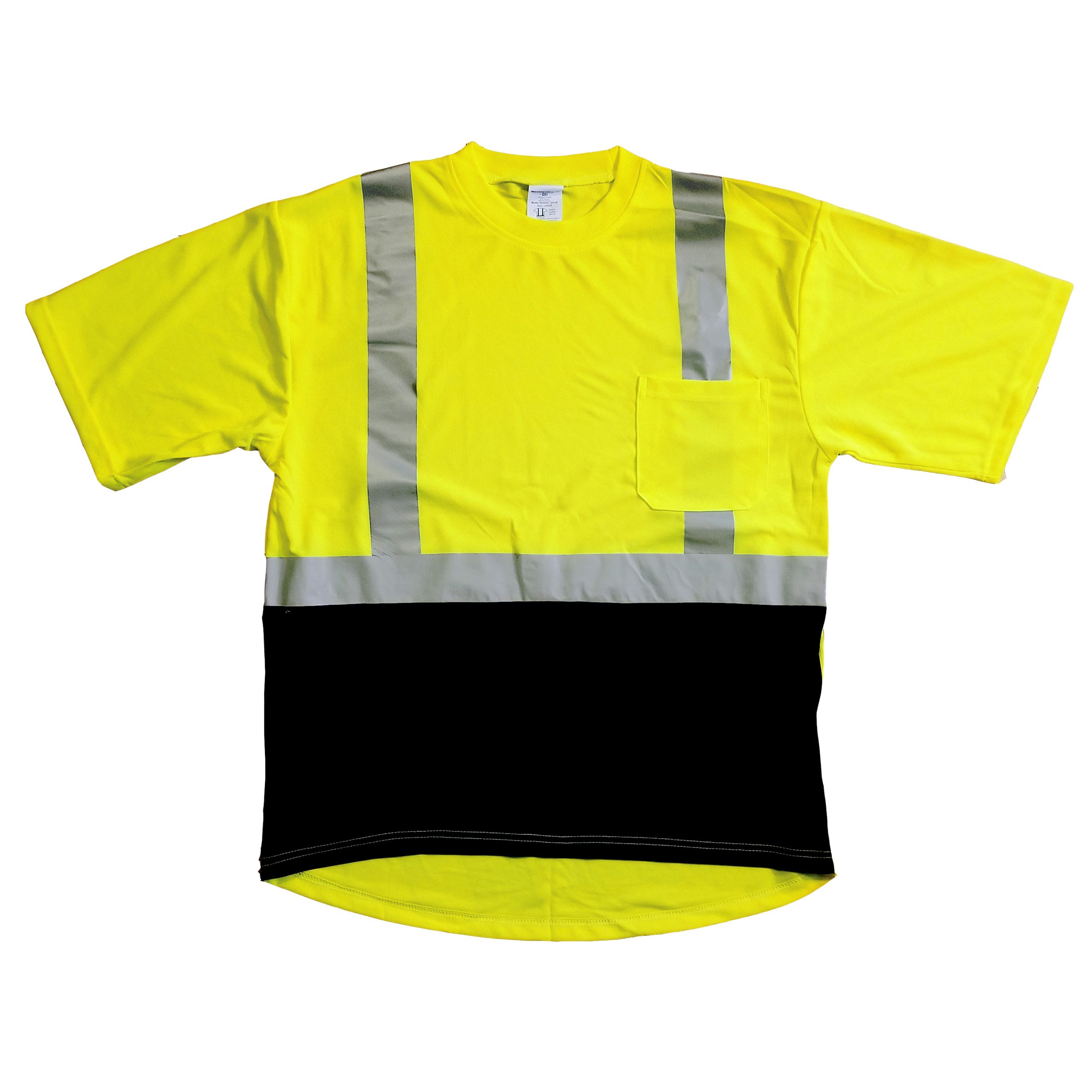 - Hi-vis yellow safety shirt with black bottom keeps garment looking cleaner longer